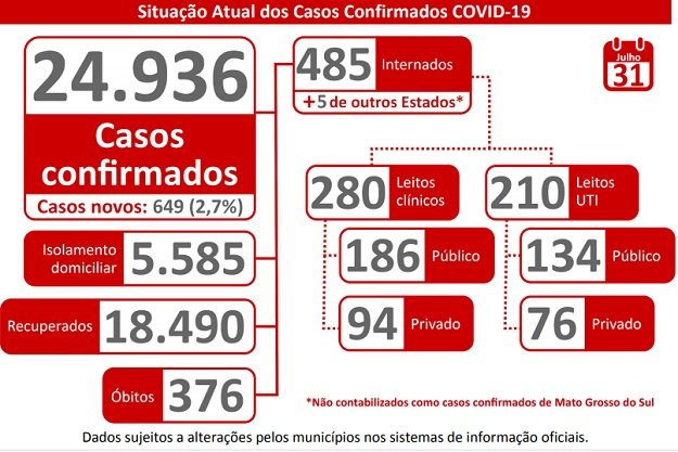 O boletim epidemiológico desta sexta-feira, dia 31, trouxe a confirmação de mais 649 exames positivos para o novo coronavírus (Covid-19) nas últimas 24 horas. Com isso, o número de casos confirmados da doença no Estado chega a 24.936.
