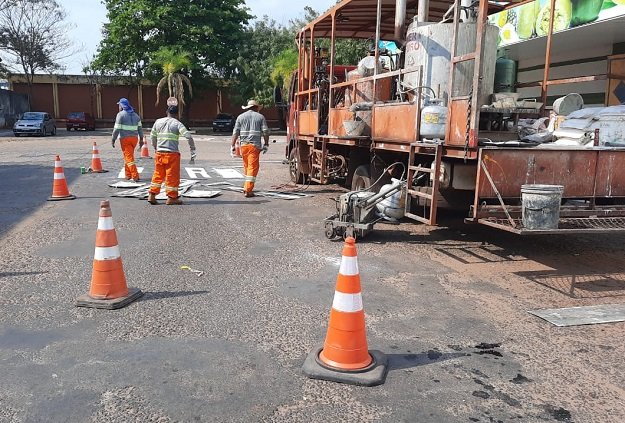 Os trabalhadores, caminhão e equipamentos para sinalização são visíveis e estão sendo colocados cones indicando a presença deles nas ruas, alertando aos motoristas. Após finalizarem a sinalização nas ruas do centro, o serviço será executado nos bairros.