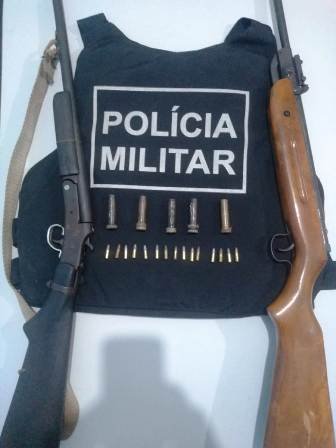A guarnição, no intuito de localizá-lo em sua residência, lograram êxito em encontrar duas armas de fogo, sendo elas: uma espingarda modificada de calibre .22 e uma outra espingarda de calibre.32, junto delas, 05 (cinco) munições de calibre .32 e 15 (quinze) de calibre .22.