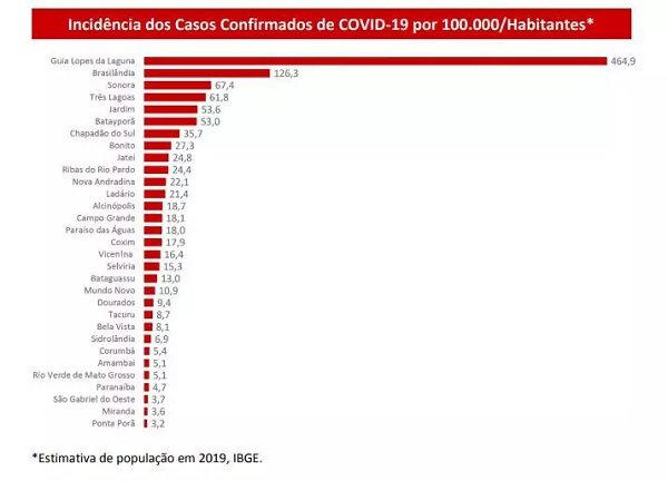 Na relação de casos novos, além dos 7 casos em Guia Lopes e 2 em Brasilândia, aparecem 4 em Três Lagoas, 3 em Campo Grande, 2 em Dourados, 2 em Jardim, 2 em Bonito, 1 em Amambai e 1 em Ponta Porã. Veja a incidência em cada uma das cidades já atingidas pelo coronavírus.
