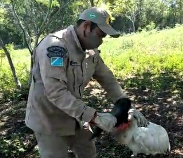 Um tuiuiú, ave símbolo do Pantanal, foi resgatado debilitado na tarde de segunda-feira (18), em Corumbá, a 415 quilômetros de Campo Grande.