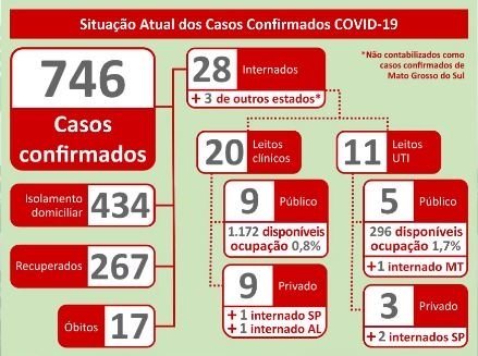 O boletim divulgado pela SES (Secretaria Estadual de Saúde) nesta quinta-feira (21) aponta que Mato Grosso do Sul totalizou, às 10h desta manhã, 746 casos confirmados de Covid-19, o novo coronavírus. De acordo com o secretário Geraldo Resende, são 53 positivos a mais nas últimas 24h.