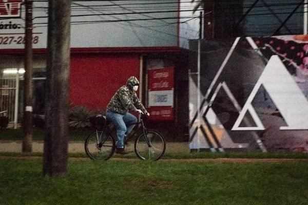 Agasalhado, ciclista na Avenida Afonso Pena enfrenta o frio nesta manhã de segunda-feira na Capital sul-mato-grossense (Foto: Henrique Kawaminami)