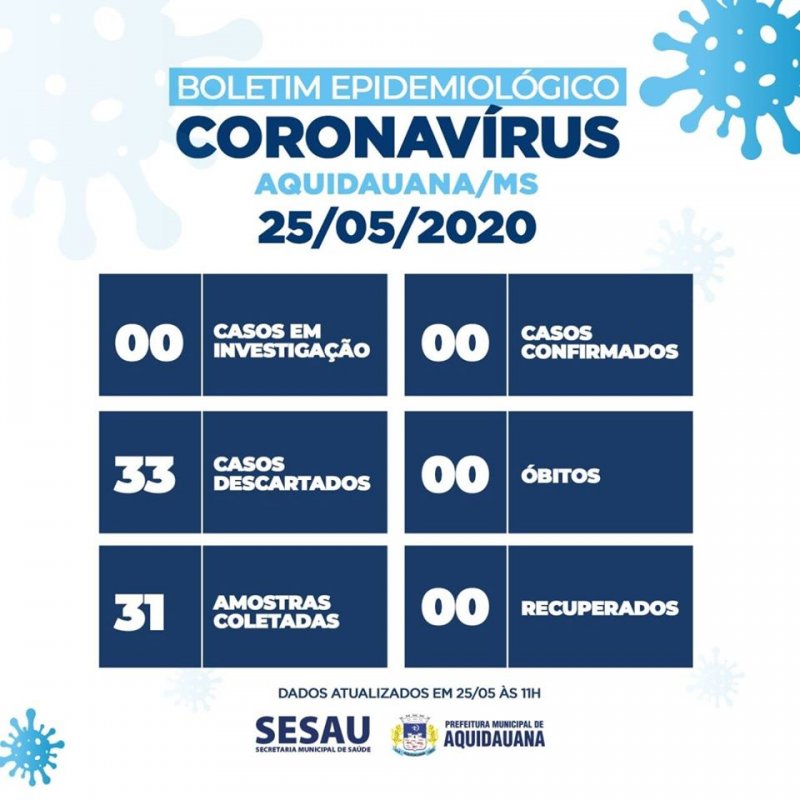 A Secretaria Municipal de Saúde de Aquidauana informa que o município não tem registros de casos suspeitos e nem confirmados de coronavírus, nesta segunda-feira, 25 de maio.
