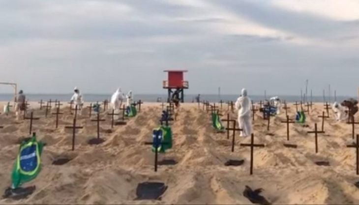 Um grupo de pessoas protestou ontem à tarde (11) contra a manifestação realizada pela organização não governamental Rio de Paz, na praia de Copacabana. Voluntários da ONG abriram 100 covas rasas na areia da praia, com cruzes e bandeiras do Brasil, para simbolizar as mortes pela covid-19 no país.