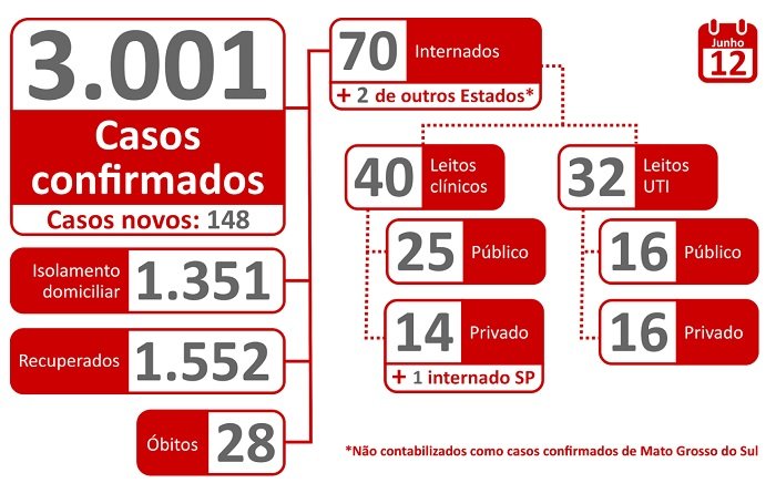 Com mais 148 exames positivos para o novo coronavírus (Covid-19) nas últimas 24 horas, o número de casos confirmados da doença no Estado chega a 3.001. Foram registrados três óbitos, passando para 28 mortes pela doença em Mato Grosso do Sul. As informações foram apresentadas nesta sexta-feira (12.06) em coletiva de imprensa on-line com autoridades estaduais.