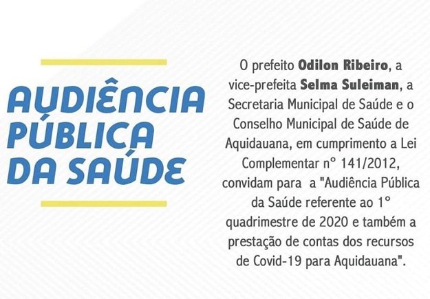 A Prefeitura de Aquidauana por meio da Secretaria Municipal de Saúde junto com o Conselho Municipal de Saúde de Aquidauana, em cumprimento a Lei Complementar n° 141/2012, comunica a realização de "Audiência Pública da Saúde" referente ao 1° quadrimestre de 2020 e, também, a prestação de contas dos recursos de Covid-19 dispinibilizados para Aquidauana.