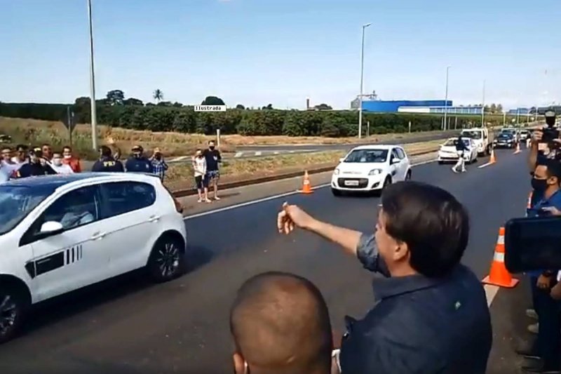 Sem vestir a máscara de proteção contra a Covid-19, que carregava nas mãos, o presidente cumprimentou um grupo de simpatizantes que, sem respeitar o distanciamento recomendado, acenaram para ele no acostamento da BR-050 com palavras de apoio ao governo.