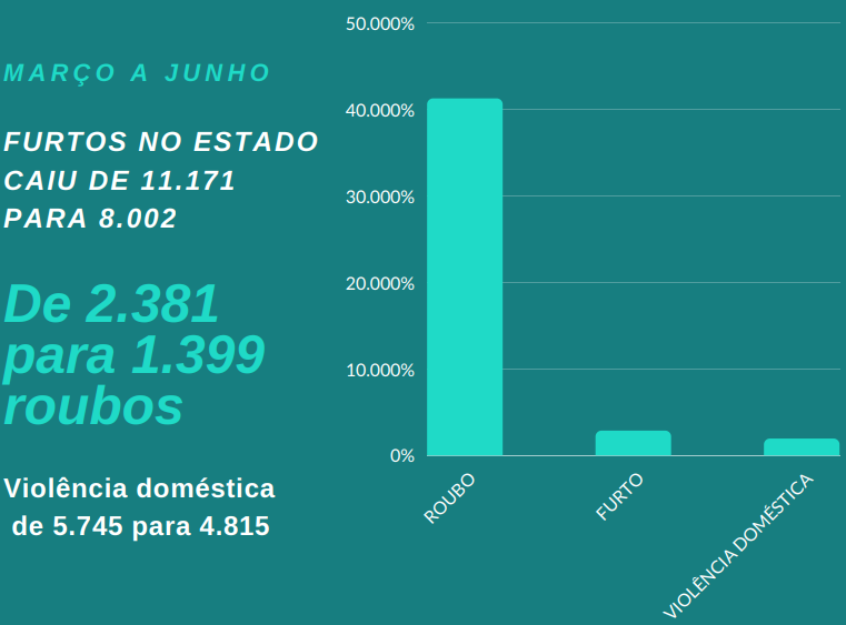 Levantamentos apresentados pela Superintendência de Inteligência de Segurança Pública (SISP) e pela Coordenadoria de Fiscalização e Controle, da Sejusp (secretaria estadual de Justiça e Segurança Pública), apontam que o número de furtos no Estado caiu 28,37%, entre março e junho, e no mesmo período, houve queda de roubos em 41, 24%. A violência doméstica também teve acentuada redução – 16,19%.