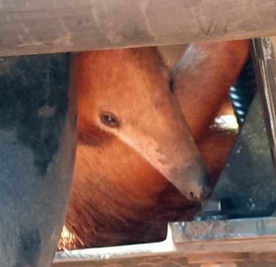 Um caminhoneiro acionou a PMA, informando que o animal se encontrava entre o chassi e o tanque de carga de combustível e não saía.
