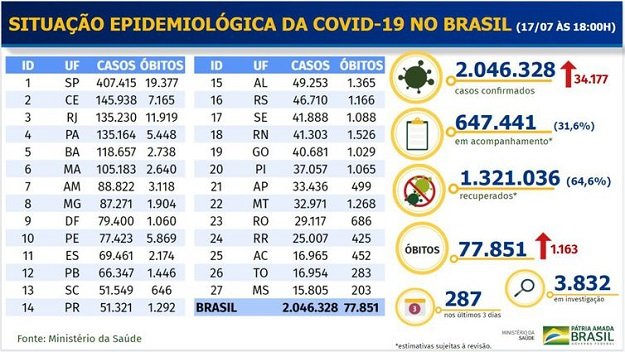 O boletim epidemiológico do Ministério da Saúde, divulgado nesta sexta-feira (17), mostrou que o novo coronavírus atingiu 2.046.328 de pessoas, no Brasil, desde o início da pandemia. Desse total, 1.321.036 pacientes conseguiram se recuperar da covid-19, doença que causou a morte de 77.851 brasileiros. Atualmente, 647.441 pacientes estão em tratamento. Nas últimas 24 horas, o país registrou 34.177 novos casoss da doença e 1.163 óbitos.