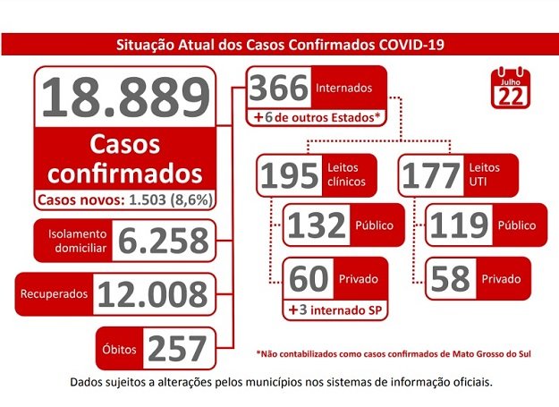 Durante a live transmitida ao vivo nas redes sociais do Governo de MS o Estado possui 18.889 casos confirmados da doença. Até o momento, são 366 internados, sendo que seis são de outros Estados. Deste total, 195 estão em leitos clínicos e 177 em leitos de UTI.