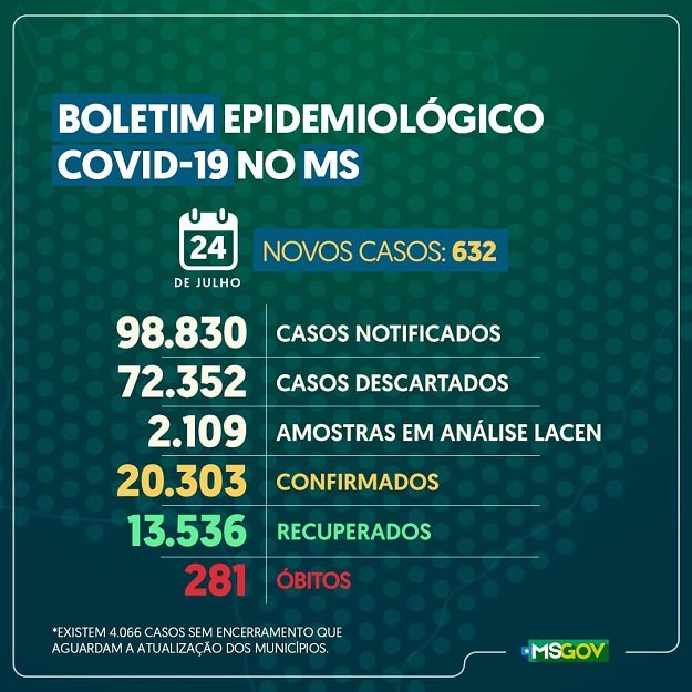 Em Mato Grosso do Sul, os números referentes ao coronavírus continuam avançando. Em 24 horas foram registrados 632 novos exames positivos e 14 óbitos por covid-19. Com isso, o Estado tem 20.303 casos da doença e 281 óbitos.