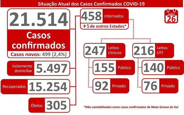 Com 499 novos exames positivos em apenas 24 horas, o Estado registra, atualmente, 21.514 casos confirmados de coronavírus, segundo o boletim epidemiológico deste domingo. Deste total, 5.497 estão em isolamento social, 458 pessoas estão internadas, sendo 5 de outros estados. 247 pessoas estão internadas em leitos clínicos e 216 em leitos de UTI. Em Mato Grosso do Sul, 305 óbitos foram registrados por covid-19.