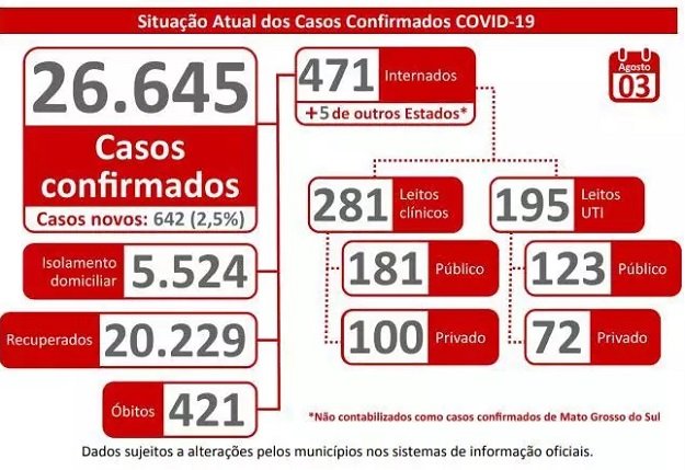 De maneira macro o boletim oficial do coronavírus em Mato Grosso do Sul conta com 26.645 casos confirmados e 421 vidas perdidas.