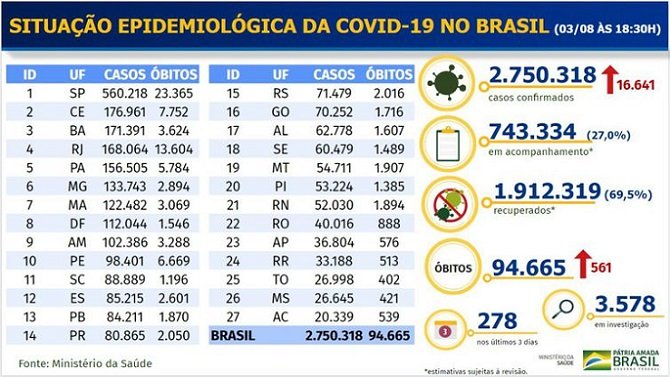 O balanço do Ministério da Saúde divulgado hoje (3) trouxe 561 novas mortes registradas nas últimas 24 horas em razão da covid-19. Com isso, o total de óbitos chega a 94.665. Ainda há 3.578 óbitos em investigação.