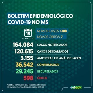A SES (Secretaria Estadual de Saúde) divulgou a atualização do boletim epidemiológico, neste sábado (15). Mato Grosso do Sul registrou 1.108 casos confirmados e 7 óbitos por coronavírus nas últimas 24 horas.