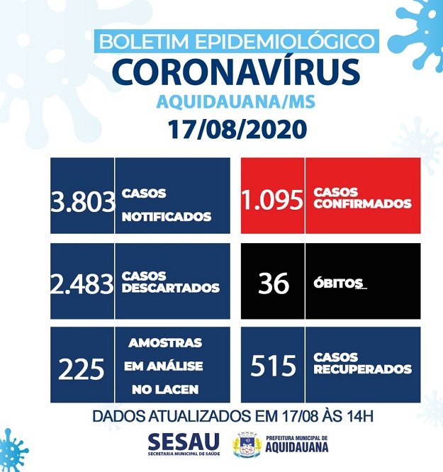 -1 homem, 74 anos, pardo, era morador do bairro Guanandy, tinha hipertensão arterial sistêmica e diabetes melittus, era positivo de Covid-19, estava hospitalizado e não resistiu ao agravamento da doença e faleceu hoje, 17/08, no Hospital Regional de Aquidauana.