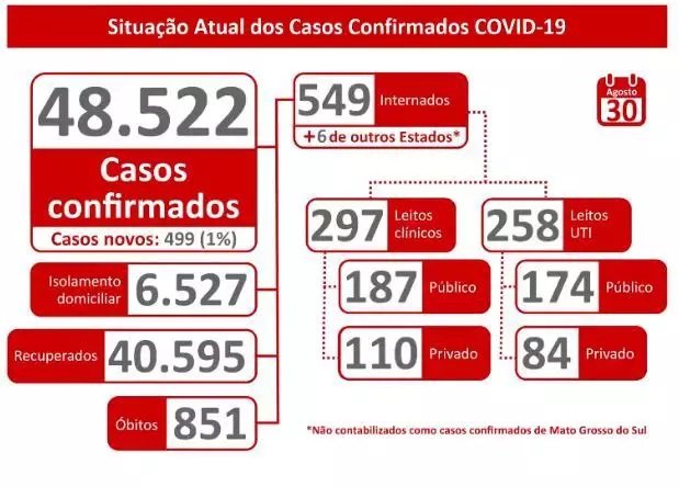O domingo acrescenta 499 testes positivos e Mato Grosso do Sul chega a 48.522 contaminados no total . O lado mais drástico da covid-19 já soma 851 mortes no Estado, 345 em Campo Grande.