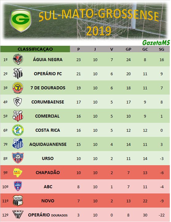 Agora, o Águia Negra lidera com 23 pontos, seguido pelo Operário FC com 21, Sete com 19 e Corumbaense fechando o G4 com 17 pontos. O Comercial e Costa Rica dividem a quinta posição com 16 pontos e o Aquidauanense é o sétimo com 15, todos classificados.