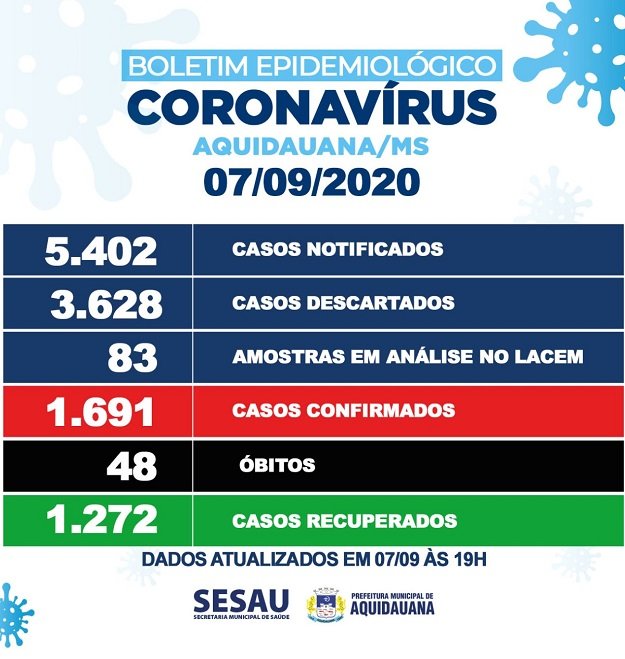 Aquidauana, até o momento, tem ao todo 1.691 casos confirmados, desses 371 pessoas positivas ativas e 48 óbitos, sendo 22 de indígenas e 26 não indígenas.