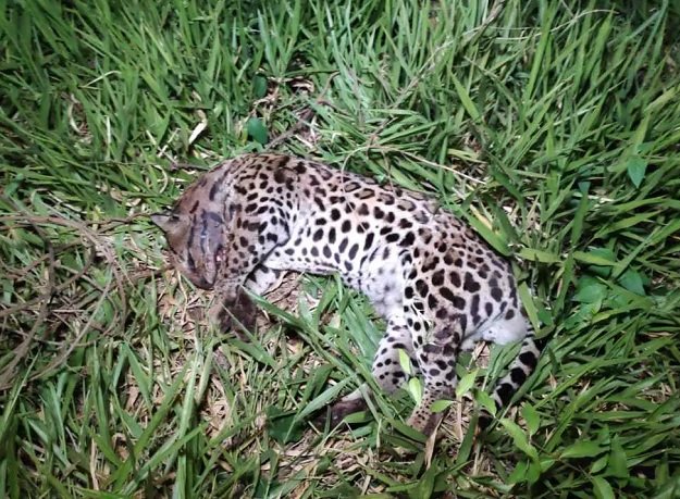 Corpo de uma jaguatirica foi encontrado na noite deste domingo (11) às margens da Rua Palmeiras, em Dourados. A suspeita é de que o animal foi morto há cerca de dois dias depois de ser atropelado.