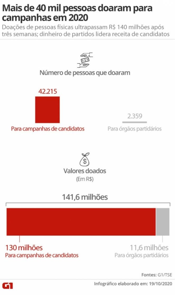 As doações de pessoas físicas já ultrapassam os R$ 140 milhões no início desta quarta semana de campanha, segundo levantamento feito pelo G1 com dados do Tribunal Superior Eleitoral (TSE). Por enquanto, mais de 40 mil pessoas já doaram dinheiro para candidatos ou mesmo para diretórios de partidos.