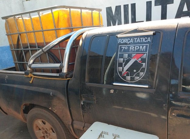 Por volta das 15h, A equipe Força Tática realizava patrulhamento rural pelas estradas vicinais que dão acesso aos assentamentos Monjolinho e São Manoel quando se depararam com uma caminhonete transportando um grande tonel de combustível no compartimento de carga.