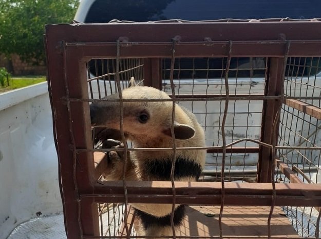 Os Policiais Militares Ambientais foram ao local rapidamente e capturaram o tamanduá, com uso de cambão e uma pinça e o colocaram em uma caixa de contenção.