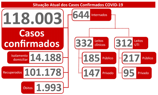 Dos 118.003 casos confirmados, 101.178 estão sem sintomas e já estão recuperados, 14.188 estão em isolamento domiciliar, e 644 estão internados. Os municípios com maior número de casos novos são Campo Grande com 604. Na sequência aparecem Dourados com 153, Corumbá com 65 e Maracaju com 61 novos casos.