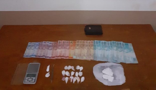O homem identificado é bem conhecido no meio policial pois possui diversos envolvimentos criminais com drogas. De posse das informações as equipes foram até sua residência e o encontraram em frente ao portão principal. Quando viu a viatura se aproximando, fugiu para dentro da casa e jogou uma sacola plástica. Após ser abordado os policiais localizaram o objeto arremessado e dentro continha 16 porções de cocaína.