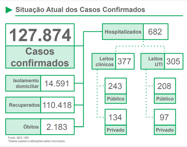 Campo Grande segue no topo, com maior número de casos e mortes registradas, sendo 553 e 23, respectivamente, de ontem para hoje. Ao todo, a Capital tem 58.615 casos confirmados e 993 óbitos.