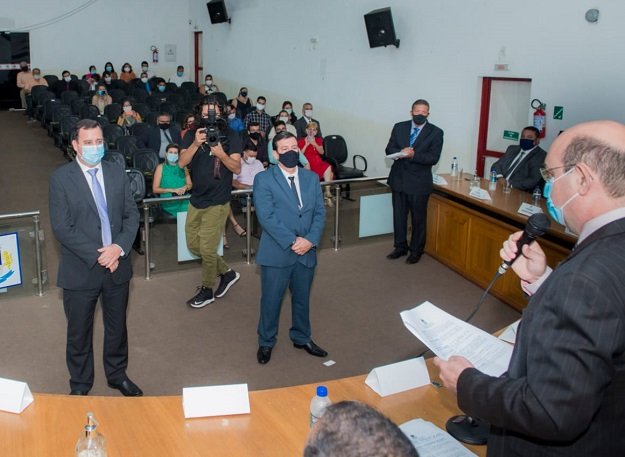 A solenidade seguiu o rito do regimento da Câmara Municipal, em que antes da posse do prefeito e vice, foi oficializada a posse dos vereadores e a eleição da mesa diretora do legislativo para o biênio 2021/2022.