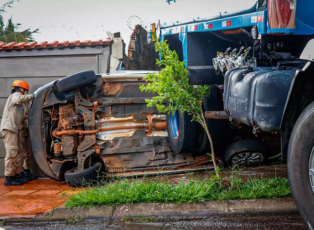 Caminhão de combustível perde o freio, prensa carro e “sobe” em muro