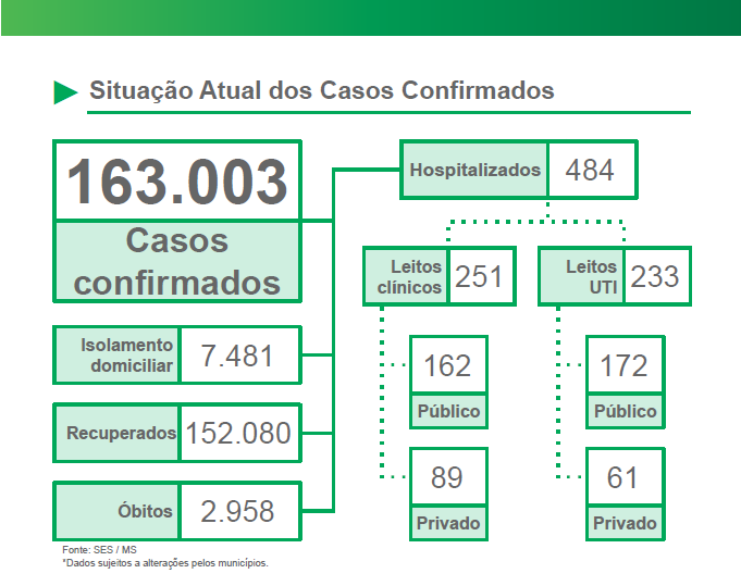 A atualização do boletim epidemiológico apresenta 738 novos casos confirmados no Estado, totalizando 163.003 desde o início da pandemia. Os municípios com mais confirmações de infectados são: Campo Grande (+255), Dourados (+98), Ponta Porã (+46), Naviraí (+43), Corumbá (+31).