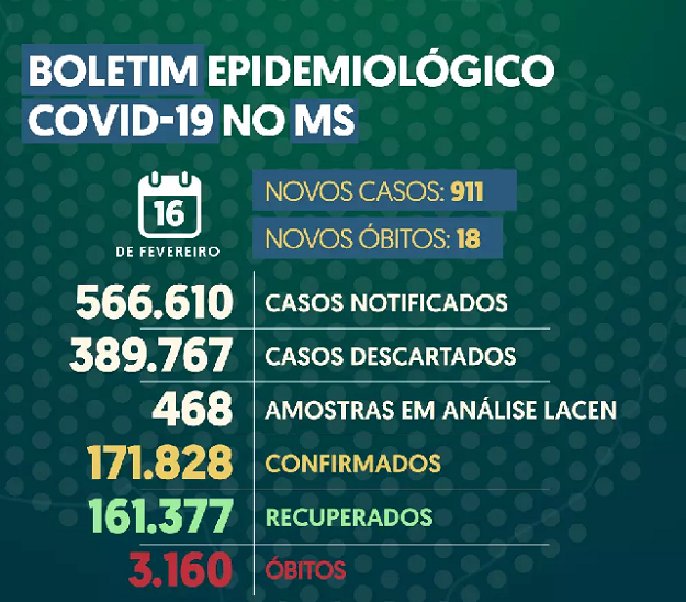Com 911 confirmações, Mato Grosso do Sul soma 171.828 casos de Covid-19 nesta terça-feira (16) conforme boletim epidemiológico divulgado pela SES (Secretaria de Estado de Saúde).