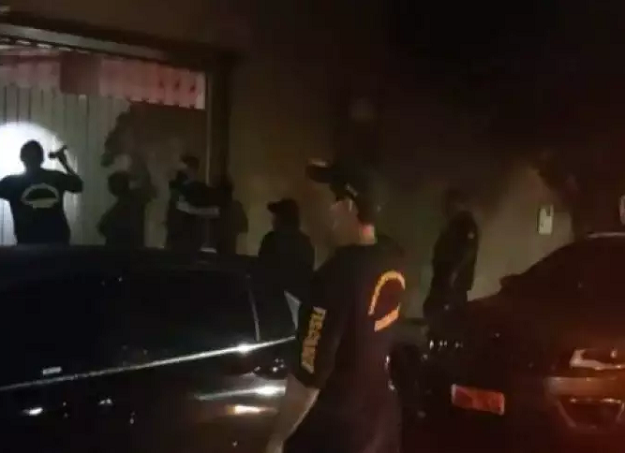 Equipe em frente a casa onde festa era realizada em Corumbá. (Foto: Diário Corumbaense)