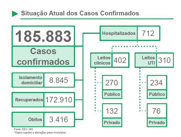 Os novos casos confirmados da doença somam 711, totalizando 185.833 sul-mato-grossenses infectados desde o início da pandemia. As cidades com maior número de confirmados são: Campo Grande (209), Três Lagoas (72), Dourados (65), Corumbá (38) e Ponta Porã (31). A média móvel indica 832,1 confirmações diárias na última semana.
