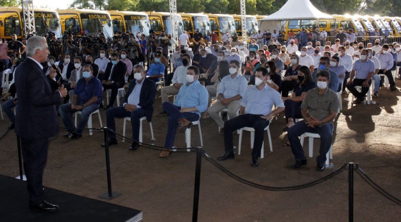 Para renovar a frota de veículos dos 79 municípios, o governador Reinaldo Azambuja entregou nesta tarde (8) 168 ônibus escolares, em solenidade que teve a presença dos ministros da Educação, Milton Ribeiro, e da Agricultura, Tereza Cristina. O investimento foi de R$ 34,13 milhões, com recursos do Fundo Nacional de Desenvolvimento da Educação (FNDE), por meio de emendas da bancada federal, e contrapartida do Governo do Estado.