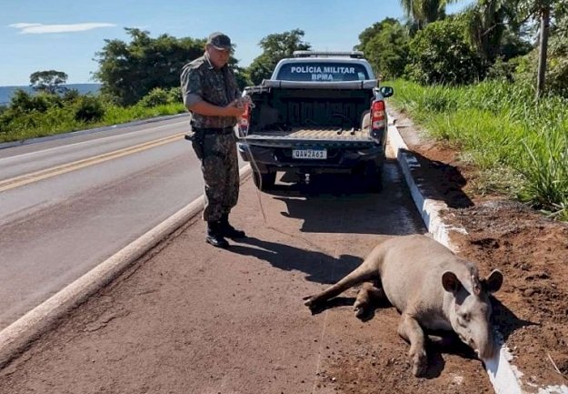 Policiais Militares Ambientais de Aquidauana receberam um telefonema neste domingo, dia 21 de março, com informações de usuários que passaram pela rodovia BR 262, na altura do km 469, no município, de que havia um animal silvestre da espécie Tapirus terrestris (anta), que estava ferido à margem da rodovia.