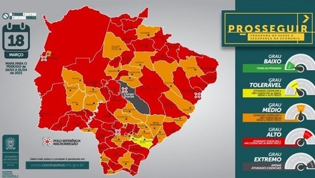 E ainda: Ribas do Rio Pardo, Rio Negro, Rio Verde de Mato Grosso, Santa Rita do Pardo, São Gabriel do Oeste, Selvíria, Sidrolândia, Sonora, Tacuru, Taquarussu e Três Lagoas. Completando o mapa, 24 municípios estão na cor laranja (médio grau de risco) e três na amarela (tolerável). Nenhum deles está na verde (baixo risco). Em relação a última semana, 17 municípios regrediram na classificação, 54 permaneceram com o mesmo grau de risco e apenas 8 progrediram.