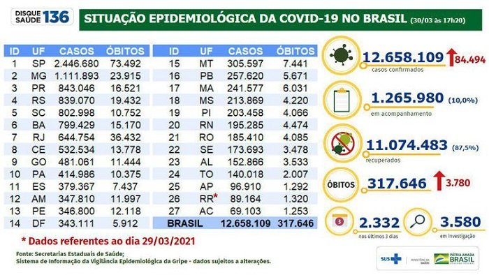 Já o total de pessoas infectadas pelo novo coronavírus desde o início da pandemia chegou a 12.658.109. Entre ontem e hoje, foram confirmados 84.494 novos diagnósticos.