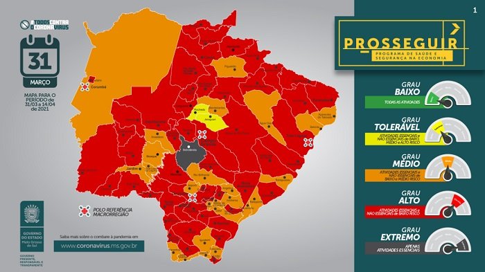 O mapa situacional do Prosseguir apresentado nesta quarta-feira (31) mostra redução de quatro para uma o número de cidades classificadas na bandeira cinza. No novo mapa apenas Sidrolândia saiu do grau alto para o extremo, quando é recomendado apenas o funcionamento de atividades essenciais.