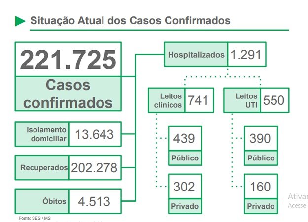 As cinco cidades com maior número de novos casos são: Campo Grande com mais 376; Dourados +139; Nova Andradina +48; Três Lagoas +39; Água Clara +30. Em virtude das medidas restritivas da semana passada, os números tiveram leve queda de 1,3.