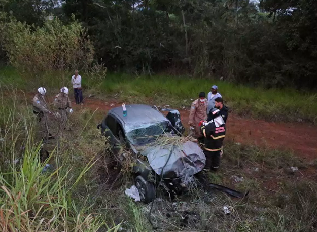 Carro foi parar em descampado fora da pista após bater em caminhão. (Foto: Paulo Francis)