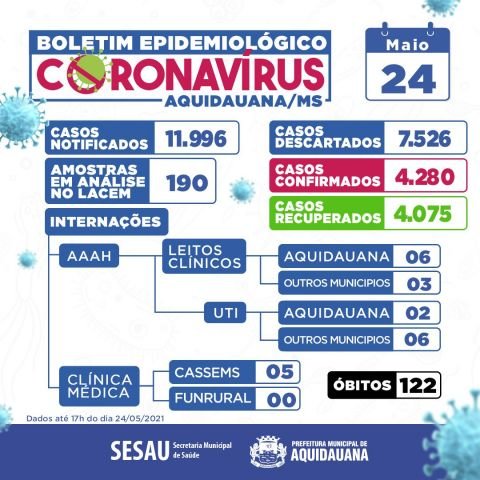 Somando os dias 22/23 e 24 - 18 novos casos de contágio foram confirmados através de exames pela Saúde de Aquidauana.