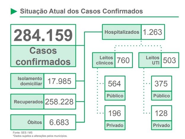 Mato Grosso do Sul confirma nesta sexta-feira (28) em Boletim Epidemiológico o contágio de mais 857 pessoas por coronavirus e 56 mortes em 24 horas, totalizando agora 6.683 óbitos.
