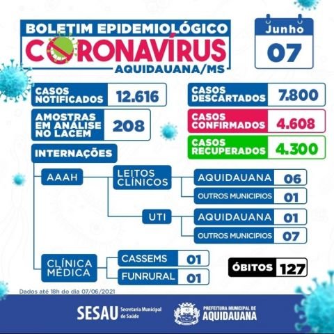 Aquidauana tem 127 mortes registradas desde o inicio da pandemia e aguarda resultado de 208 exames já realizados. 17 pessoas estão internadas, sendo 8 em UTI. Sete pacientes são de outros municipios da região.