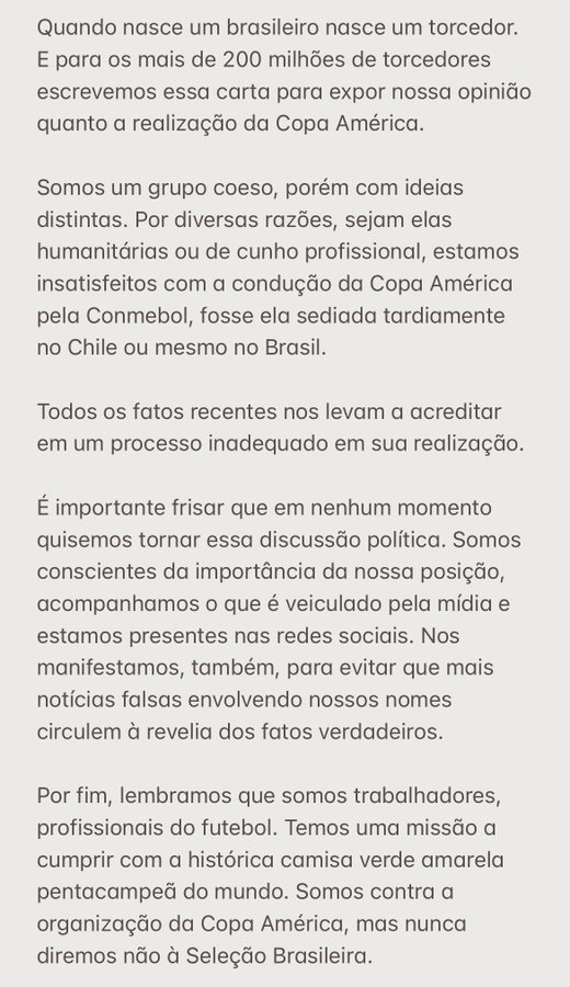 No manifesto, os jogadores declararam que não quiseram tornar a discussão sobre a Copa América "política" e que estão insatisfeitos "por diversas razões, sejam elas humanitárias ou de cunho profissional" com a condução da competição, "fosse ela sediada tardiamente no Chile ou mesmo no Brasil". Eles concluem a nota dizendo que possuem "uma missão a cumprir com a histórica camisa verde amarela pentacampeã do mundo" e "nunca diremos não à seleção brasileira".