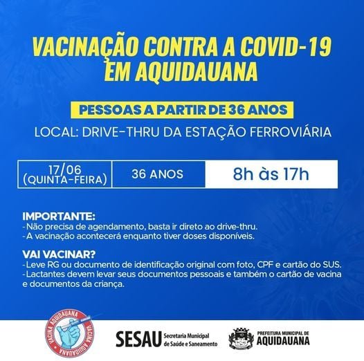 Por isso, Secretaria Municipal de Saúde de Aquidauana informa como será realizada a vacinação contra a Covid-19, no drive-thru da Estação Ferroviária:
